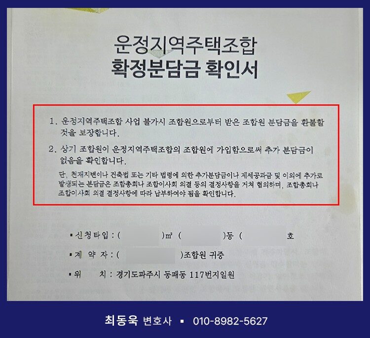 최동욱 변호사는 이미 동일 사업장을 상대로 계약취소 소송을 제기하여 승소한 경험이 있었던 만큼, 상담 과정에서 의뢰인이 가입 당시 사업장으로부터 안심보장증서 또는 확정 분담금 확인서를 교부받았는지 여부를 중점적으로 확인하였습니다. 검토 결과, 의뢰인 역시 가입 당시 “사업이 불가능할 경우 조합원으로부터 받은 분담금을 환불한다”, “추가 분담금은 없다”는 내용이 기재된 확정 분담금 확인서를 발급받으신 사실이 확인되었습니다.