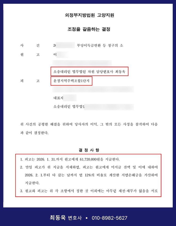 이에 최동욱 변호사는 의뢰인을 대리하여 계약취소 소송을 제기하였고, 사건을 심리한 의정부지방법원 고양지원은 조정을 갈음하는 결정을 통해 운정지역주택조합이 의뢰인에게 납입금 전액을 반환할 것을 결정하였습니다. 해당 결정은 피고 측의 이의 제기가 없을 경우 확정되어, 판결과 동일한 효력을 가지게 됩니다.