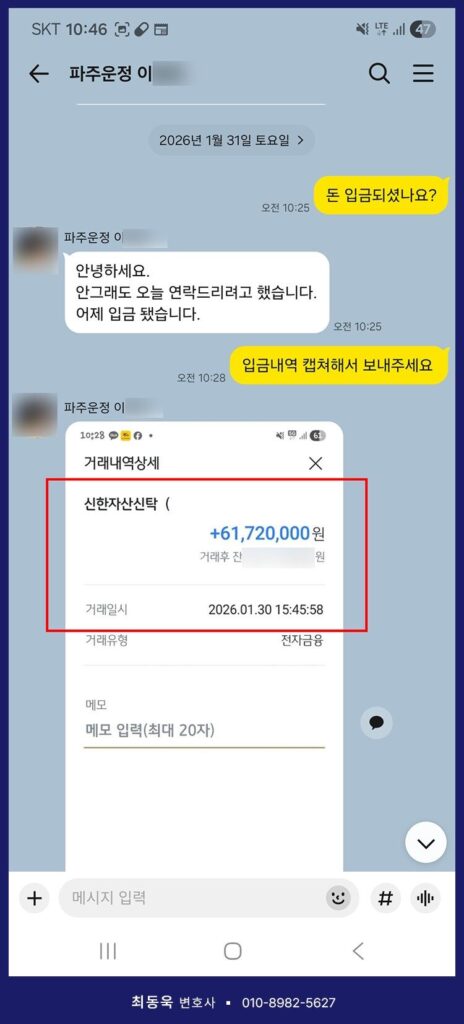 결국 피고의 이의가 제기되지 않아 결정이 확정되었고, 최동욱 변호사는 의뢰인이 실제로 피해 금원을 회수할 수 있도록 강제집행 절차를 진행하였습니다. 그 결과 2026년 1월 31일, 의뢰인께서는 납입금 6,172만 원 전액을 반환받아 조합에서 성공적으로 탈퇴하시고 일상으로 복귀하실 수 있게 되었습니다.