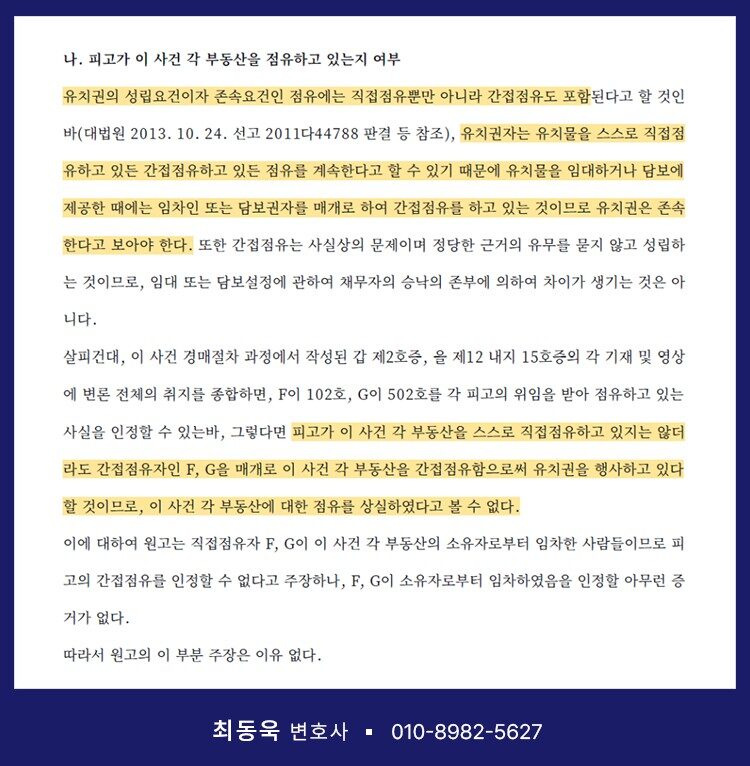 유치권 인정 판례 – 간접점유를 통한 승소 사례