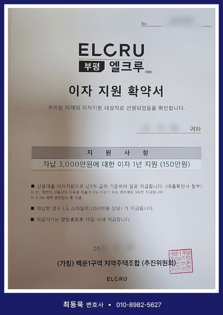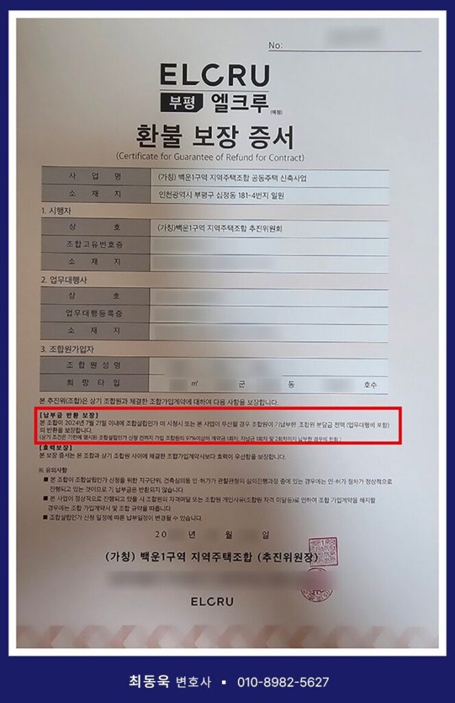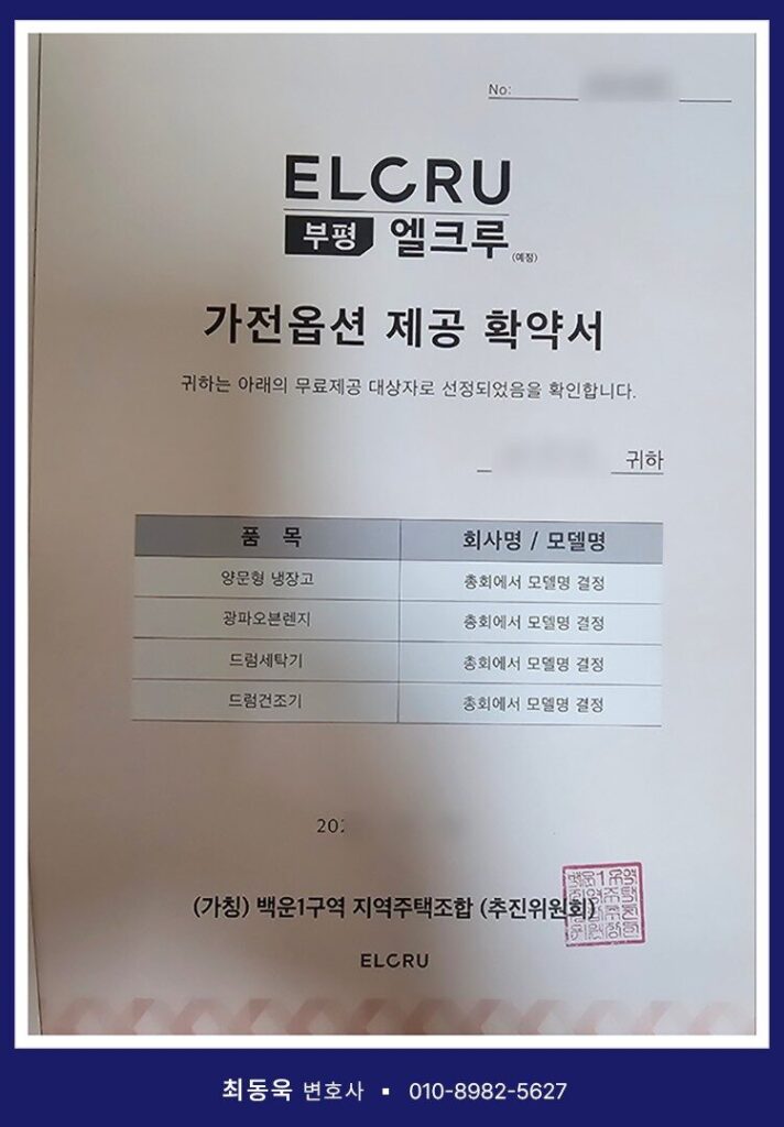 인천광역시 부평구 십정동 181-4번지 일원에서 ‘부평엘크루’라는 명칭으로 아파트 건립을 추진한 백운1구역 지역주택조합 역시 이러한 유형에 해당하는 사업장이라 할 수 있습니다. 해당 조합은 조합원 모집 과정에서 환불보장증서(안심보장증서)를 비롯하여, 발코니 확장 무상옵션 제공 확약서, 가전옵션 제공 확약서, 이자 지원 확약서 등 각종 혜택을 약속하는 약정서를 조합원들에게 교부하였습니다.