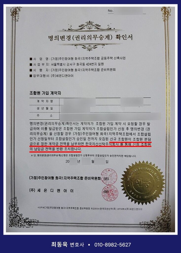 최동욱 변호사의 법률 검토에 따르면, 주민참여형 화곡1 지역주택조합에 가입하신 일부 계약자들께서는 이른바 <명의변경(권리의무승계) 확인서>를 발급받으신 사실이 확인되고 있습니다. 해당 문서는 기존 조합원이 탈퇴하고 새로운 조합원에게 권리를 승계하는 경우의 처리 절차를 정리한 것으로, “신규 조합원이 계약금 전액을 납부하면 기존 조합원에게 기존 납입금 전액을 반환한다”는 취지의 내용이 기재되어 있습니다.