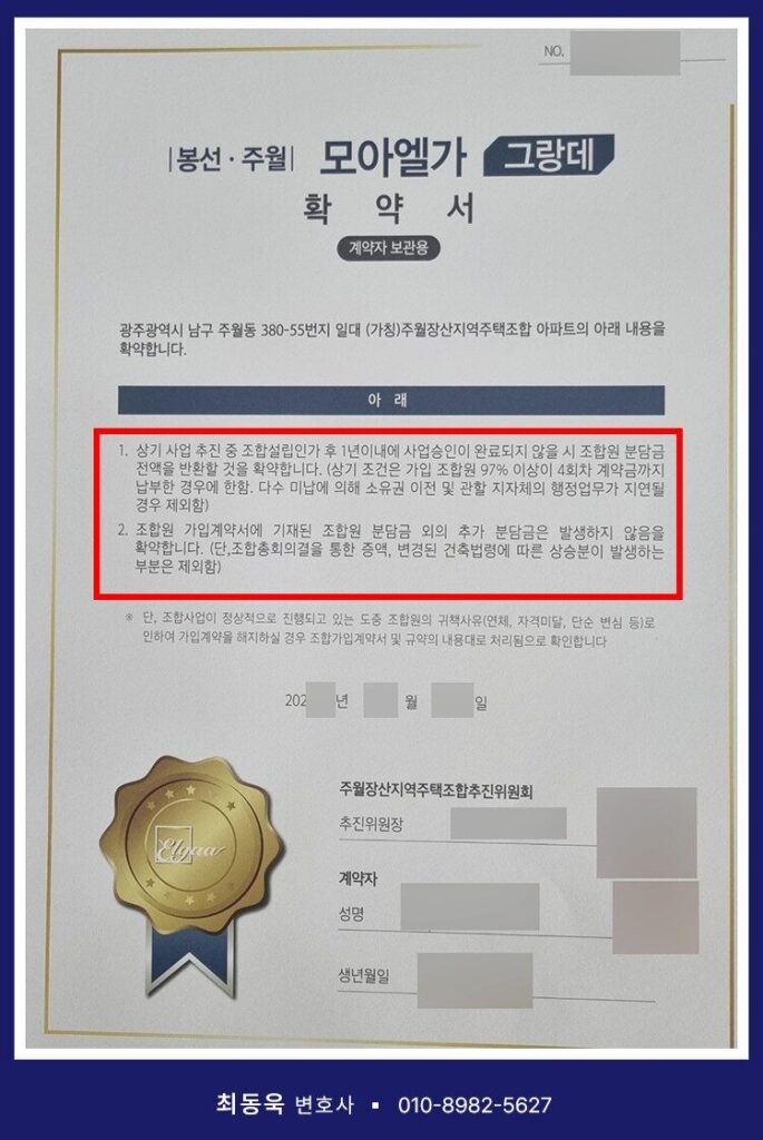 지역주택조합은 조합원들이 납부한 분담금을 재원으로 사업을 추진하는 구조이므로, 조합의 재산을 처분하여 전액환불을 보장하거나 추가 분담금이 없음을 확정적으로 약정하기 위해서는 조합원 총회의 결의를 통해 구성원들의 동의를 받는 절차가 필수적입니다. 그럼에도 불구하고 주월장산 지역주택조합을 포함한 다수의 지역주택조합들은 이러한 적법한 절차를 거치지 않은 채 확약서를 발급하고, 마치 사업이 안전하게 보장되는 것처럼 홍보하여 계약을 유도해 온 사례가 적지 않습니다. 이와 같은 행위는 조합원에 대한 기망행위로 평가될 가능성이 높습니다.