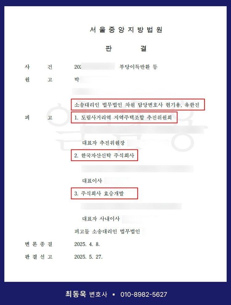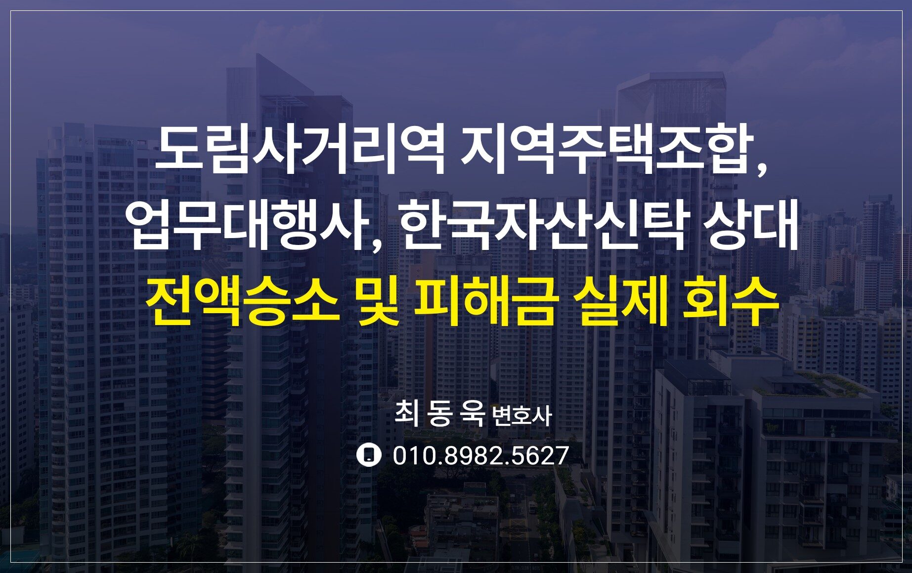 최근에는 의뢰인을 대리하여 도림사거리역 지역주택조합을 비롯해 업무대행사 및 신탁사인 한국자산신탁을 상대로 동시에 소송을 제기하였고, 그 결과 조합 가입 계약의 무효는 물론 신탁사에 대한 금전지급 책임까지 인정받는 판결을 이끌어냈습니다. 더 나아가, 해당 판결을 바탕으로 총 1억 6천만 원의 판결금을 실제로 회수하는 데 성공하였습니다.