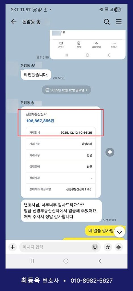이후 최동욱 변호사는 해당 승소 판결을 통해 확보한 집행권원을 바탕으로 즉시 강제집행 절차에 착수하였고, 그 결과 의뢰인께서는 2026년 1월 21일에 납입금 1억 4,500만 원 및 지연이자 약 1,900만 원을 포함한 총 1억 6,400만 원을 실제로 반환받으시며 사건을 성공적으로 종결하실 수 있었습니다.