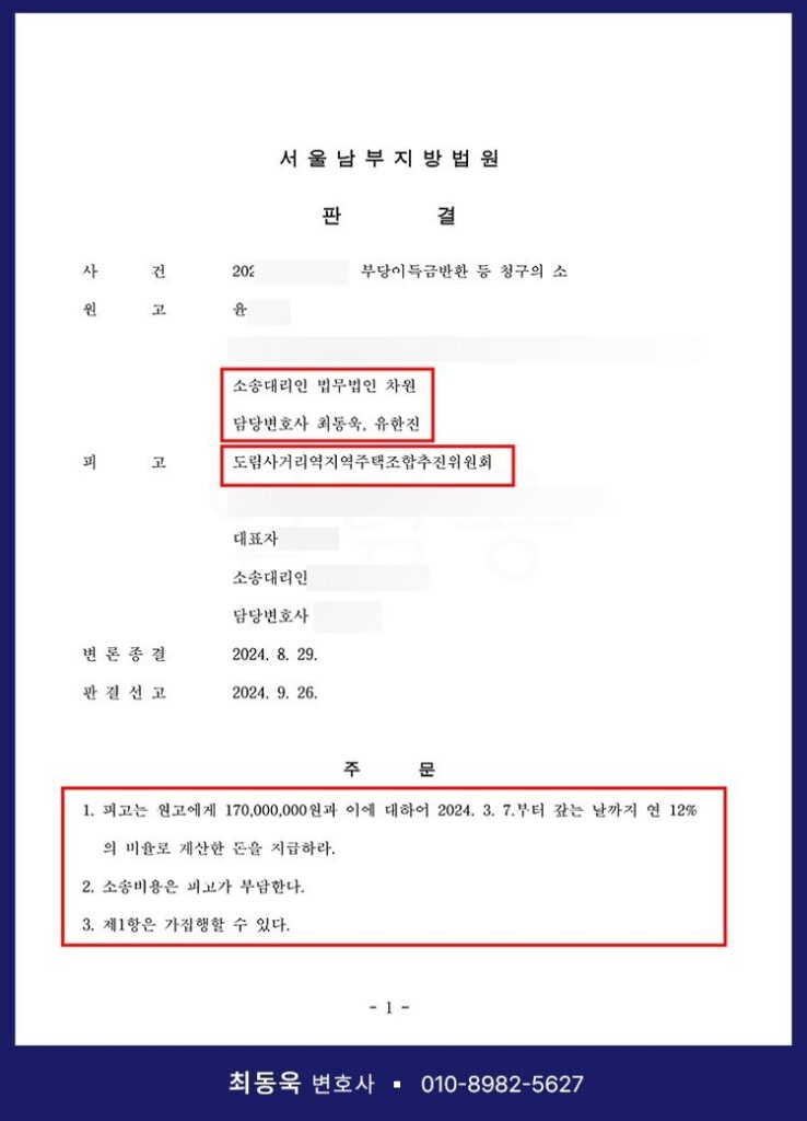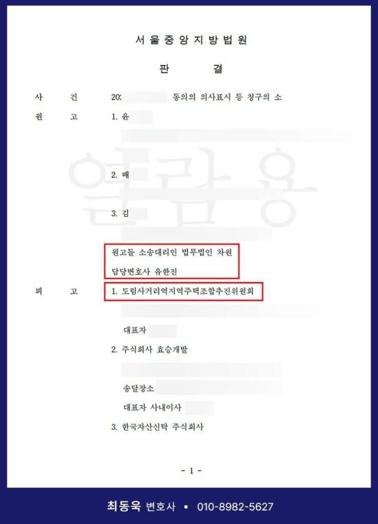 지역주택조합이 보유한 분담금은 조합원 전체의 총유에 해당하므로, 이를 반환하기 위한 약정을 체결하기 위해서는 사전에 총회 결의를 통한 조합원들의 동의가 필수적으로 요구됩니다. 그럼에도 불구하고 위 사업장은 이러한 절차를 거치지 않은 채 해당 문서를 활용하였고, 이에 최동욱 변호사는 이를 근거로 계약취소 소송을 제기하여 서울남부지방법원으로부터 전액 승소 판결을 이끌어냈습니다.