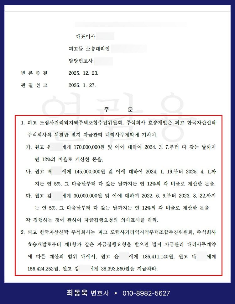 이에 최동욱 변호사는 의뢰인들의 실질적인 권리 회복을 위해, 조합뿐만 아니라 업무대행사 및 한국자산신탁을 상대로 판결금 지급을 구하는 추심금청구 소송을 추가로 제기하였습니다.