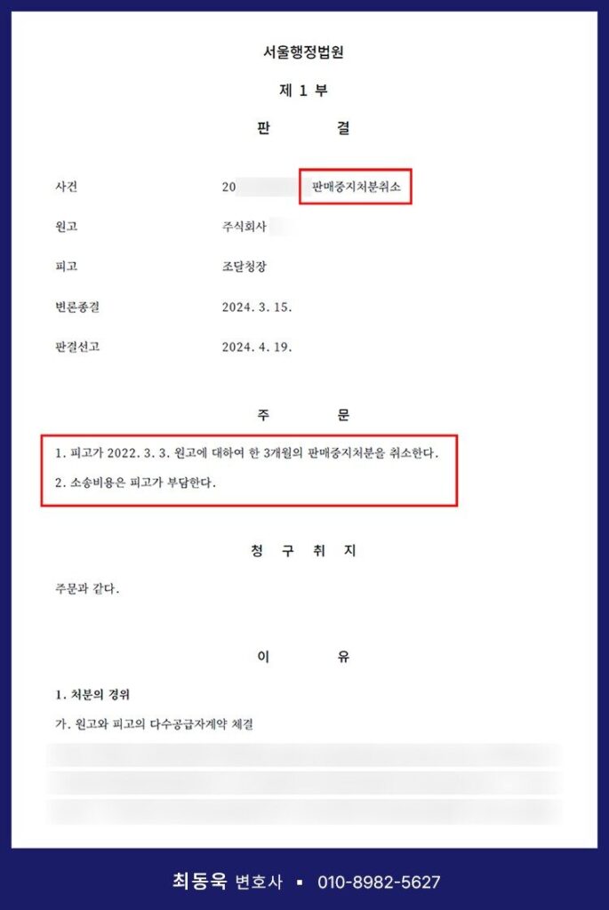 법원은 피고가 제시한 자료만으로는 직접생산 위반을 추정할 신빙성 있는 근거가 있다고 보기 어렵다고 판단하였고, 결국 서울행정법원은 판매중지 처분을 취소하라는 원고 승소 판결을 선고하였습니다.