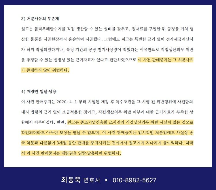 이에 따른 법원의 판단을 살펴보면, 법원은 먼저, 판매중지 처분이 기업에 회복하기 어려운 손해를 초래한다는 점을 분명히 하였습니다. 그에 따라 ‘직접생산의무 위반을 추정할 신빙성 있는 근거자료’는 엄격하게 해석·적용되어야 한다고 판시하였습니다.