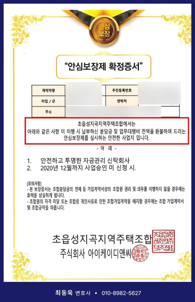 아래 사항 미이행 시 납부한 분담금 및 업무대행비 전액을 환불해 드리는 안심보장제를 실시하는 안전한 사업지입니다