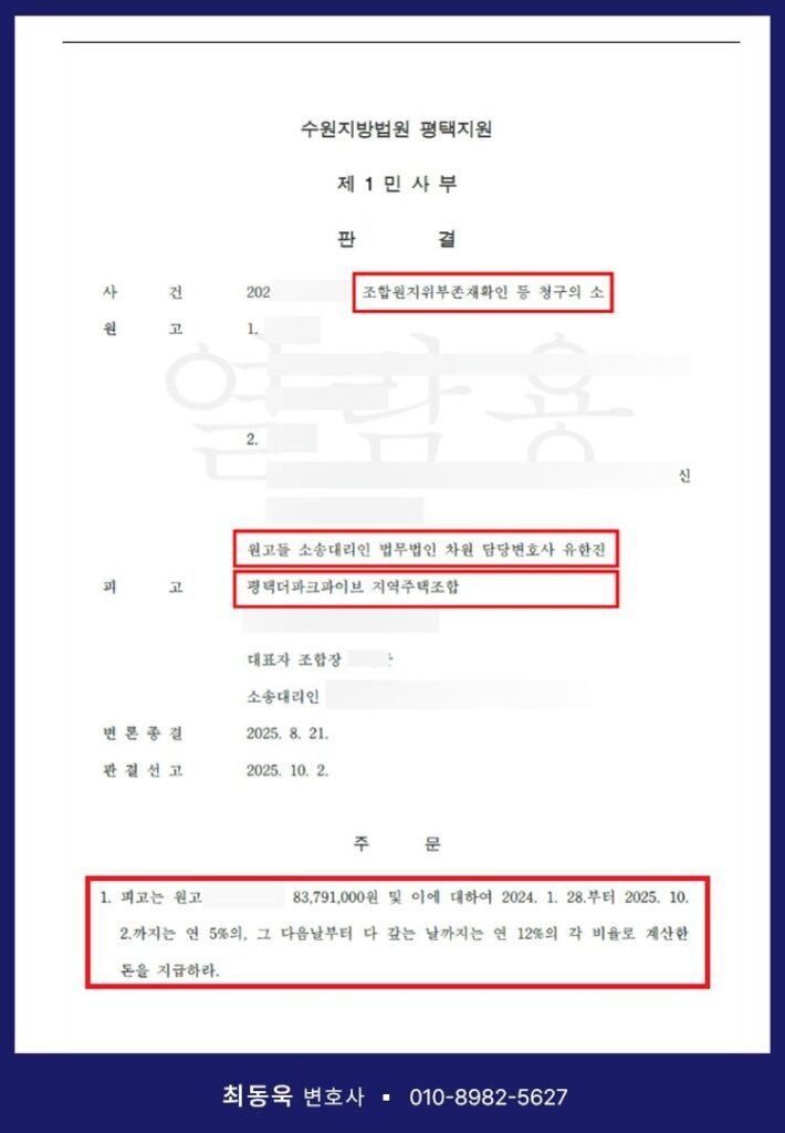 그 결과, 수원지방법원 평택지원 은 조합원이 자격을 상실한 의뢰인에게 약 8,400만 원을 반환할 의무가 있다고 확정하는 승소판결을 선고하였습니다.