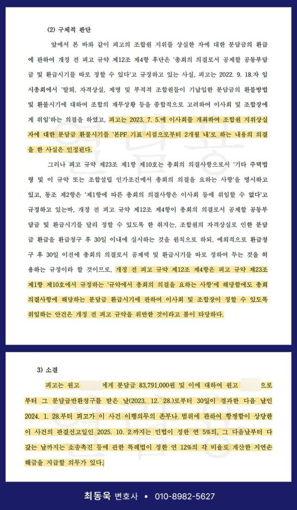 법원은 먼저, 의뢰인의 자격 상실을 인정했습니다. 그리고 분담금 중 실제로 돌려줘야 할 금액, 즉 업무추진비를 제외한 약 8,400만 원을 반환해야 한다고 판결했습니다. 또한, 환불 시기에 관해서 조합이 주장한 “이사회 결정에 따른 PF 대출 이후 환불”이라는 조건은, 환불은 총회의 결의사항으로 이사회가 정할 수 없다는 점을 들어 규약 위반·무효라고 판단했습니다.